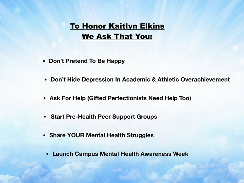 My call to action is don’t let one of your classmate’s parents get a call from the police under your watch while you’re classmates with them, you know? We need a buddy system, right? We need something, right? To honor Kaitlyn Elkins, I, on behalf of Rhonda and her family, am asking that you please don’t pretend to be happy. That’s not a good strategic move. A lot of physicians do that. It’s not a recipe for success. Don’t hide your depression in academic and athletic overachievement. Please ask for help, and understand that gifted perfectionists need help too. Start a peer support group at your school. Maybe share your mental health struggles, and launch a mental health awareness week? There’s a lot of things that you can do.