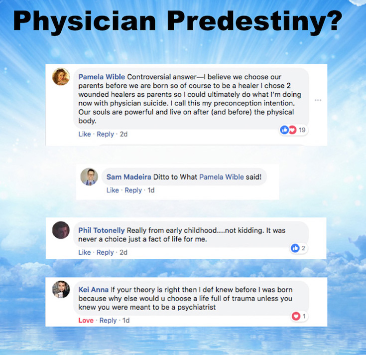 So you don’t have to agree with me on this, but it seems to make sense to me. And when I posted this online, I wasn’t sure what the response would be. But what do you know. Sam Madeira, a naturopath on the East coast, feels exactly the same way. Phil Totonelly—a cardiologist outside of New York City felt the same way from early childhood. He felt like it was never really a choice—just a fact of life. He just felt drawn to this profession. And then a psych resident friend of mine writes, “If your theory is right then I definitely knew before I was born, because why else would you choose a life full of trauma unless you knew you were meant to be a psychiatrist.”