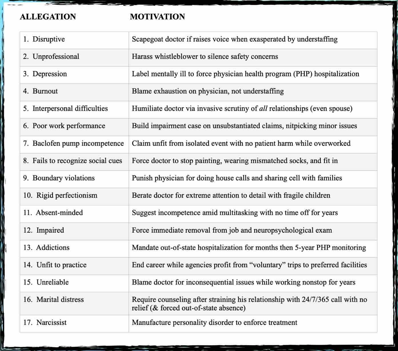 An impairment allegation is a fast and tidy way to destroy a whistleblower (without getting blood directly on your hands). On allegation alone, a doctor must stop working, may not practice elsewhere—and is guilty as charged in the eyes of the medical board.